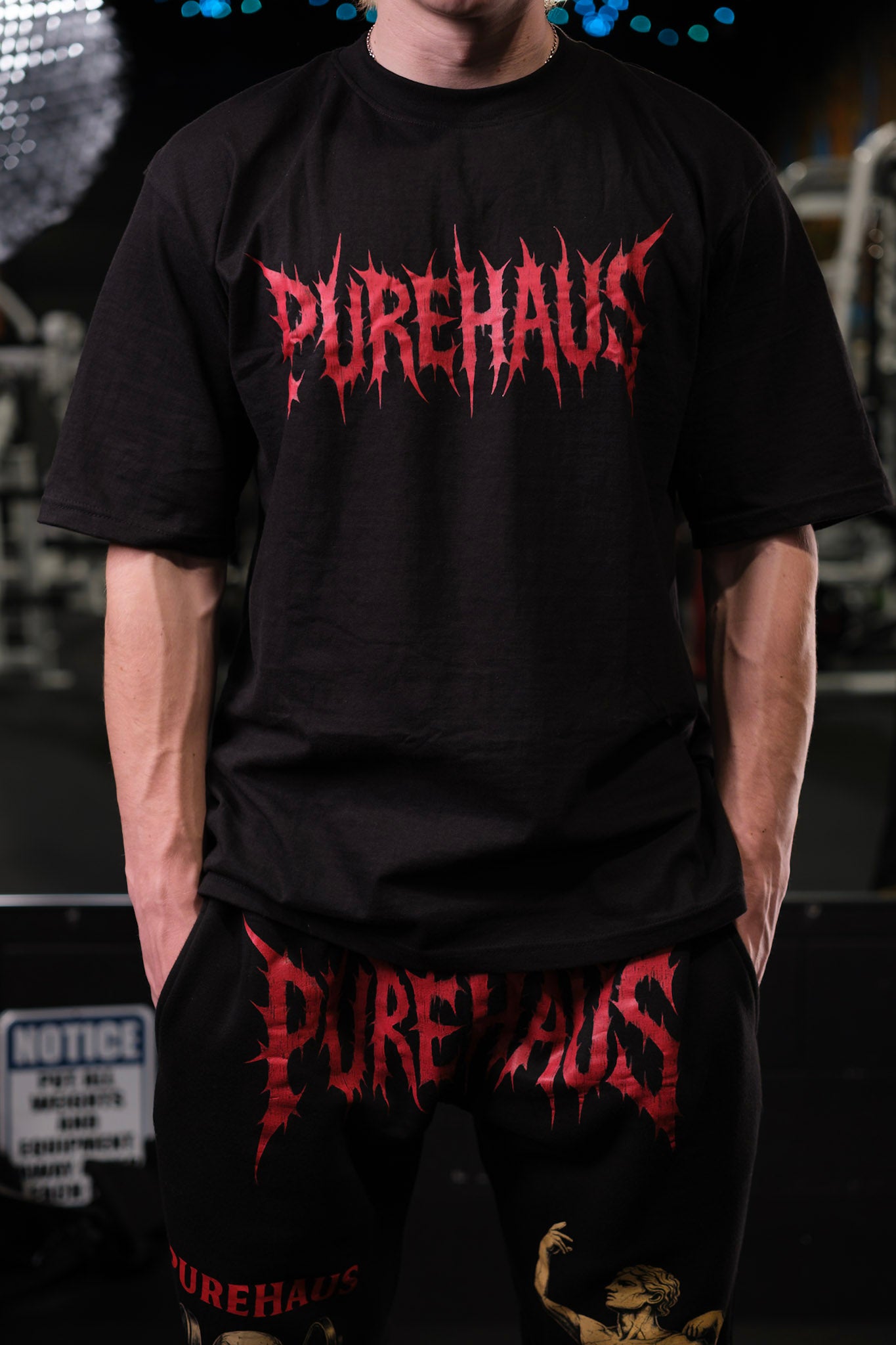 - Front: Oversized PureHaus logo in blood-red with classic strength artwork — flexing statue, roaring lion, and “Aut Vincere Aut Mori” (“Conquer or Die”).